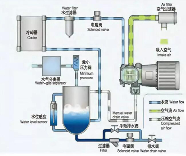 水潤滑無油螺桿機系統(tǒng)基本都是可自動根據設置的換水周期實現(xiàn)不停機下自動換水為客戶省心。
